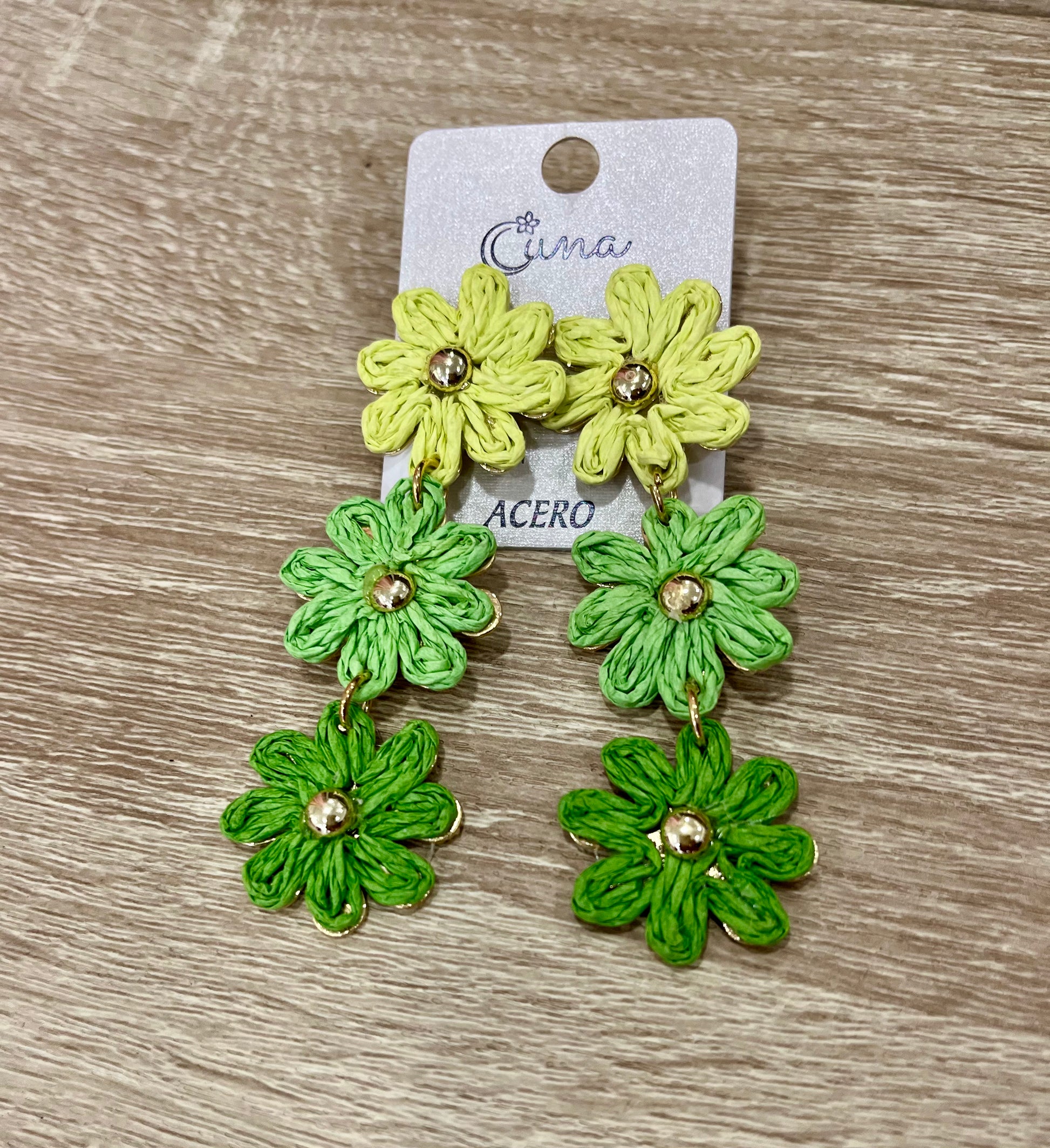 PENDIENTES ACERO FLORES RAFIA VERDE