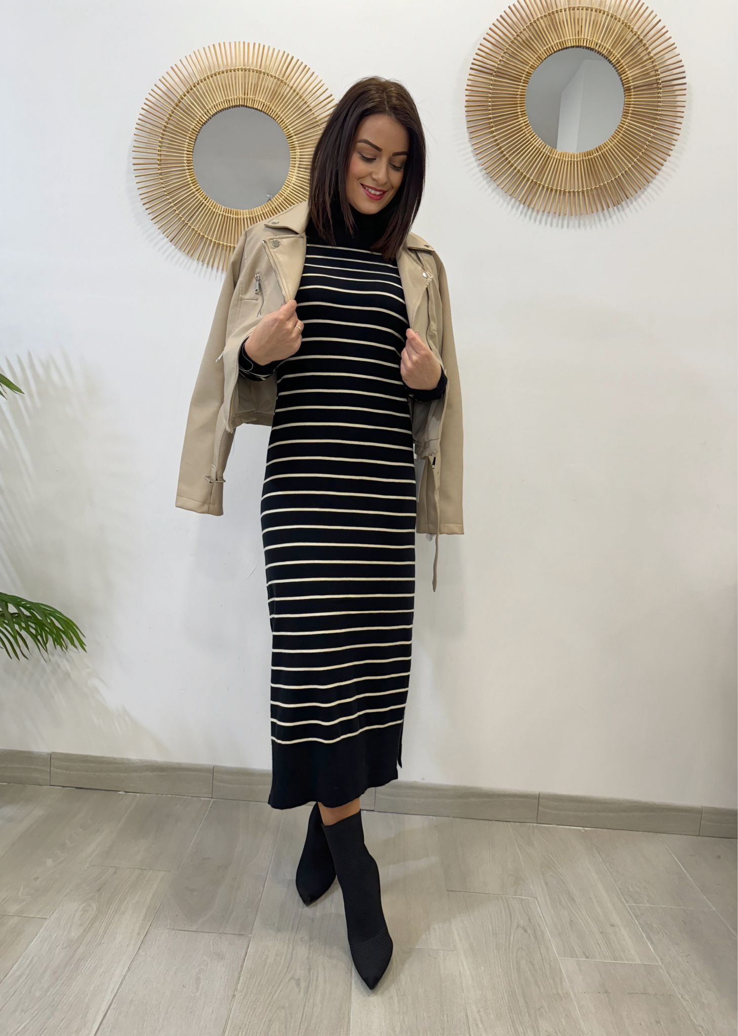 VESTIDO CUELLO VUELTO RAYAS NEGRO